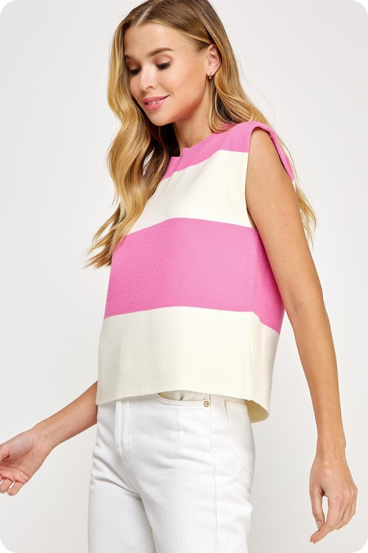 Blusa din mangas en estampado a rallas color blanco con rosa.