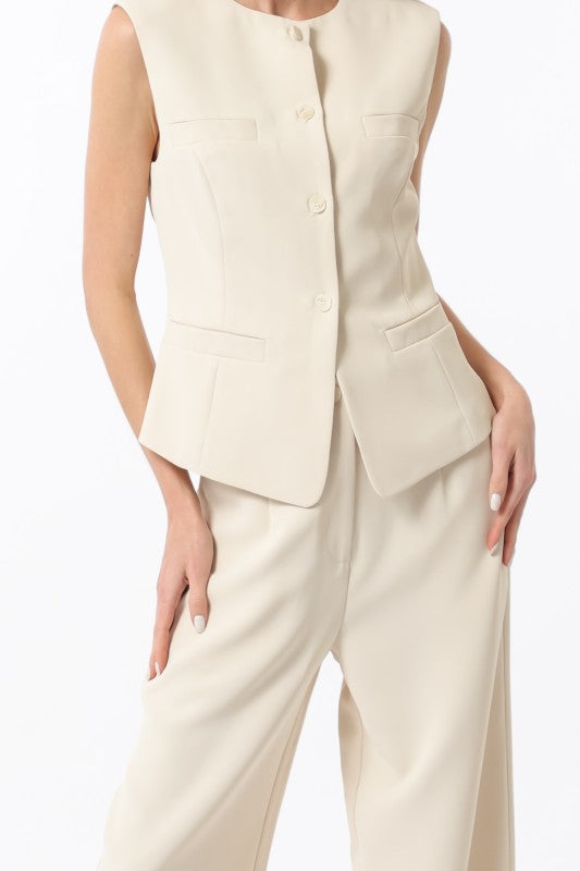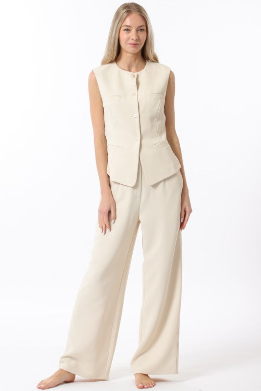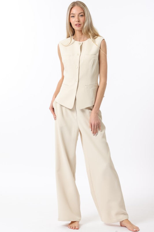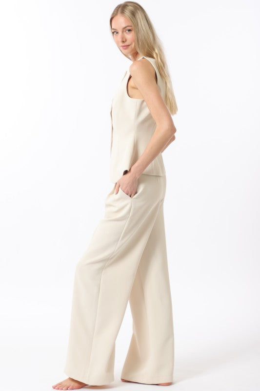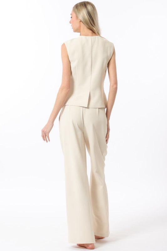Hermoso set de pantalon y chaleco en tela beige, el chaleco con broche de ajuste en la parte posterior.