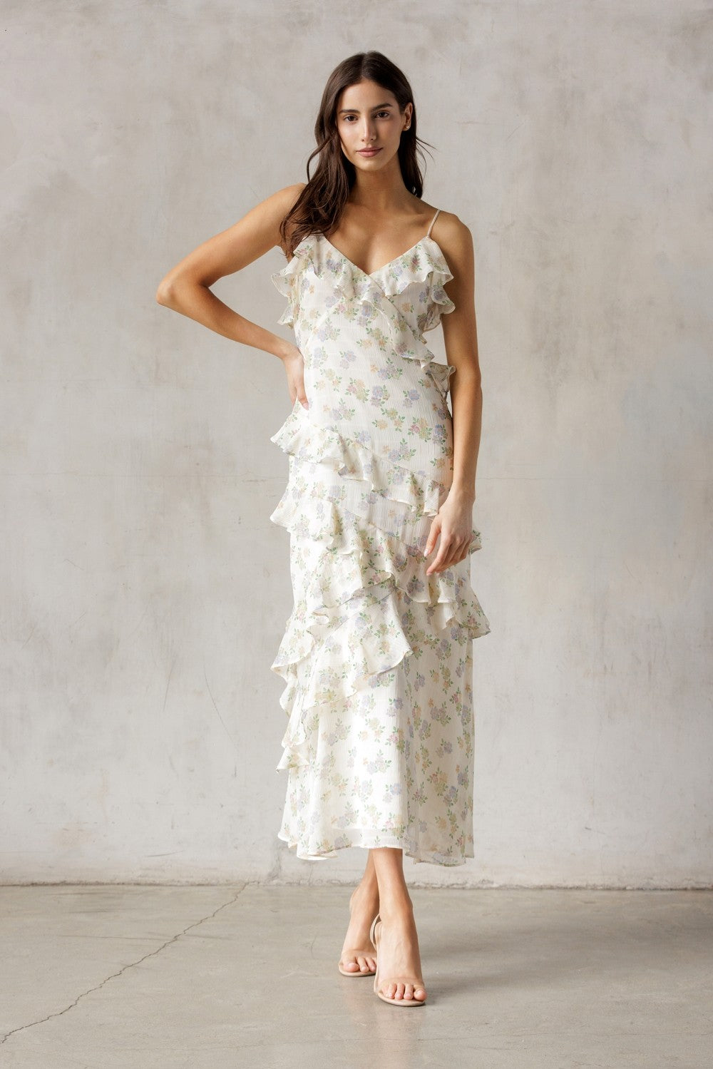 VESTIDO MAXI EN FONDO COLOR BLANCO ESTAMPADO DE FLORES EN COLORES PASTEL Y LIGEROS OLANES, ESPALDA DESCUBIERTA.