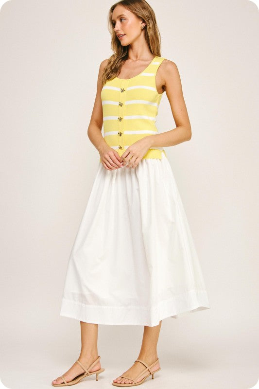 Maxi vestido con falda en color blanco y parte superior en color amarillo a rayas con detalles en forma de abejita en los botones.